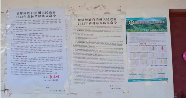 12月以来,组织观看《森林草原防灭火大讲堂第七讲(视频)》1场46人(次)、开展森林防灭火演练1期46人(次),在森林防火重点区域、主要交通要道、进山路口等重点位置发放《森林草原防灭火户主责任书》200份、粘贴《楚雄彝族自治州人民政府2023年森林草原防火命令》120份、悬挂“五彩旗”125面、宣传牌74块、播放“小蜜蜂”累计600小时。将森林草原防火宣传工作全覆盖、无死角。
