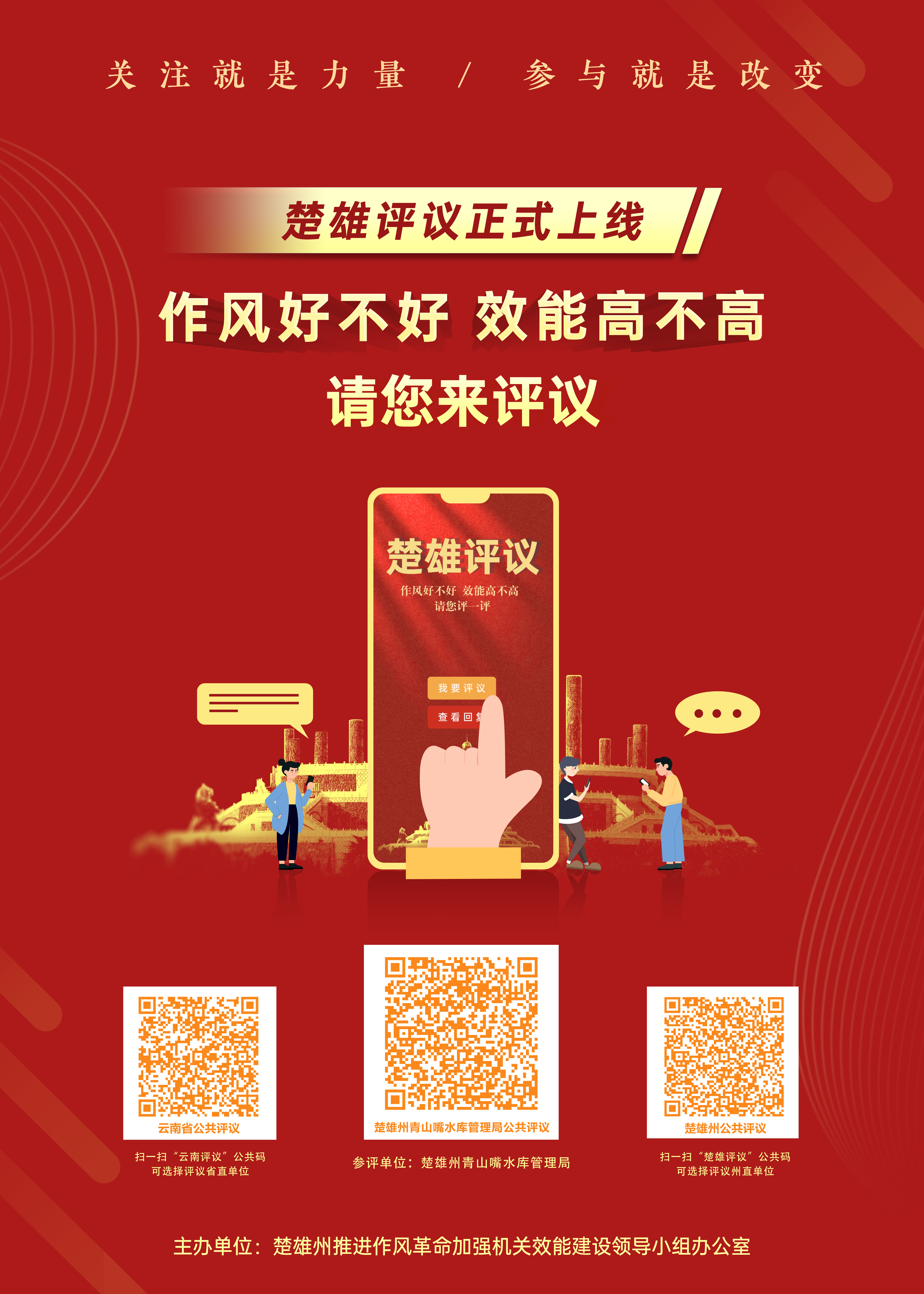 评议活动本着广泛性、群众性、代表性、知情性的原则,在“楚雄青山嘴水库工程建设管理局”网站、“绿美青山湖”微信公众号公布“楚雄州青山嘴水库管理局公共评议”二维码,在机关办公楼公示栏、大厅显眼处和各楼层醒目位置张挂“楚雄州青山嘴水库管理局公共评议”二维码,热忱欢迎广大干部职工、群众通过扫码对楚雄州青山嘴水库管理局履职尽责、作风效能等作出评价,通过互动平台进行留言,提出意见建议。楚雄州青山嘴水库工程建设管理局开展群众评议机关作风活动领导小组办公室将通过网络平台对留言和反映的问题进行回复、处置,定期梳理,立行立改。