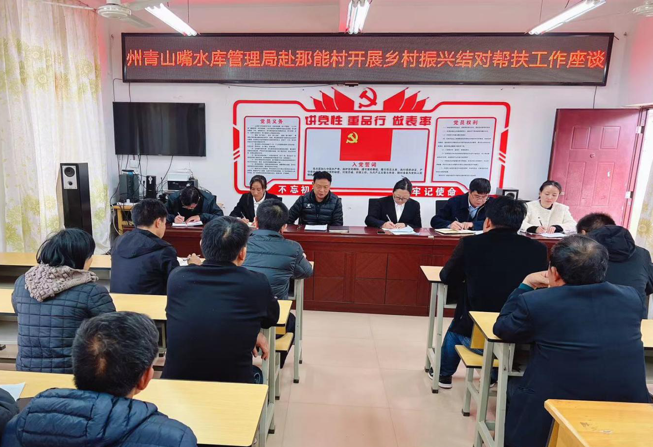 随后,州青山嘴水库工程建设管理局主要领导在那能村委会讲授党课,并开展乡村振兴结对帮扶工作座谈,认真听取了驻村工作队和村“两委”关于基层党建、巩固拓展脱贫攻坚成果、特色产业花卉种植、污水处理项目建设等工作情况汇报。